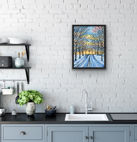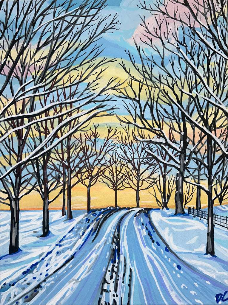 ‘Apricity’ meaning the warmth of sun in the winter, is an original painting of a country road in the winter.