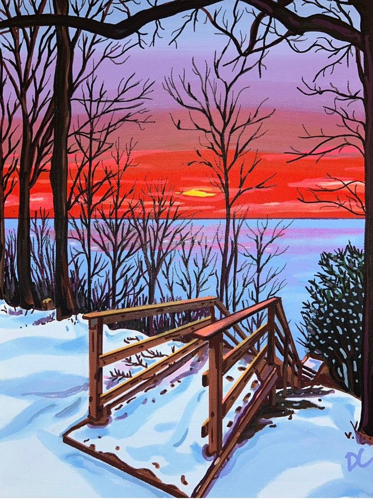 Introducing ‘Reflective Moments’, A fiery winter sunset over Lake Huron frames a snow-covered staircase, inviting quiet reflection amid the crisp, tranquil landscape.